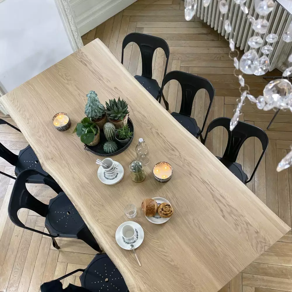 Fabriqué en chêne massif rigoureusement sélectionné, le plateau se distingue par ses bords live-edge travaillés à la main. Chaque pièce est singulière et témoigne du savoir-faire de haute ébénisterie.
