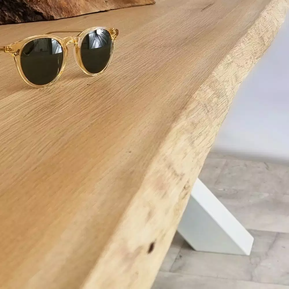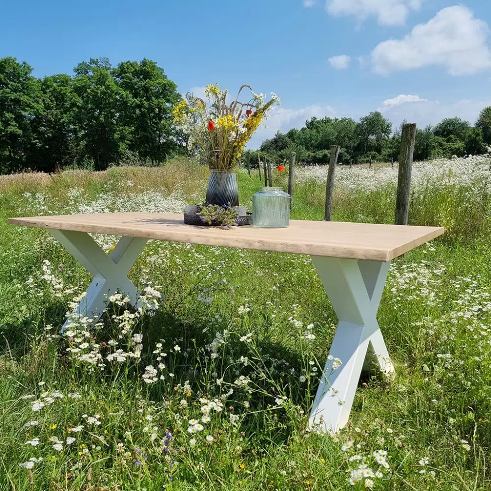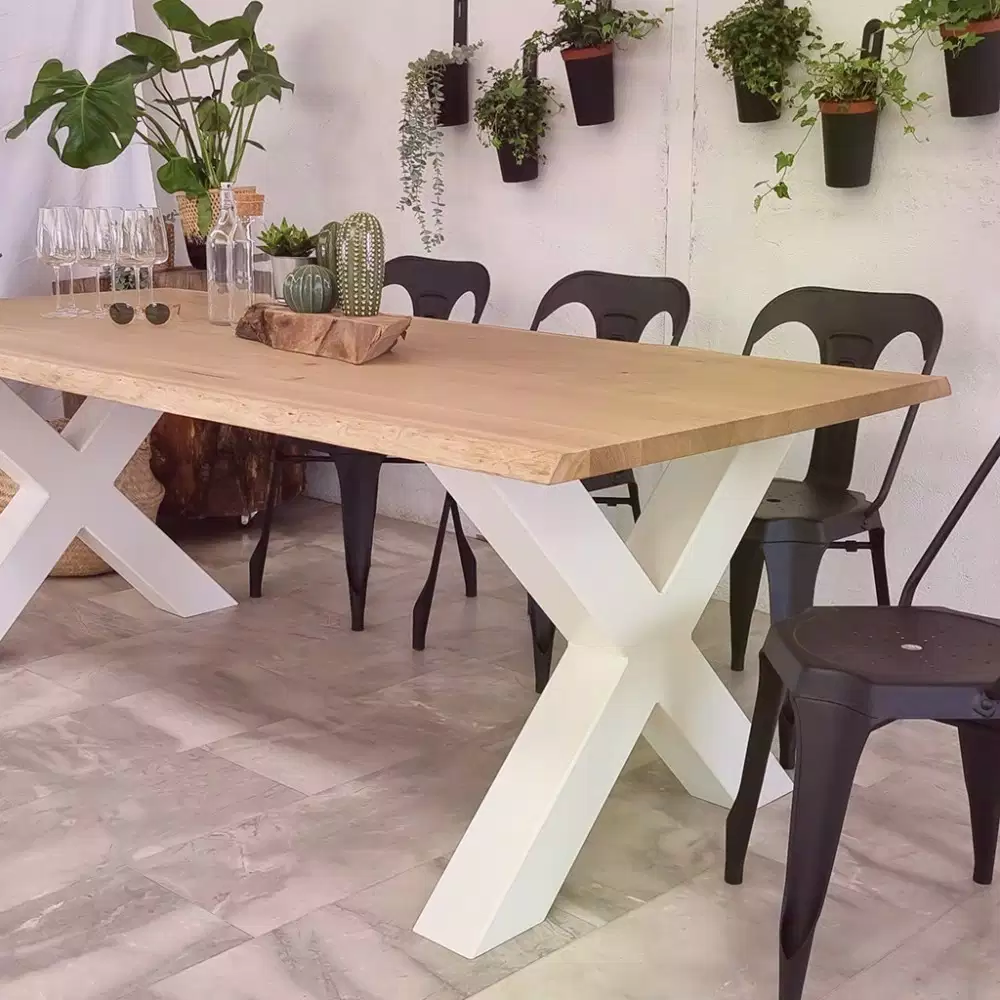 Le piètement blanc croisé crée une esthétique moderne et aérienne, tandis que le plateau en chêne massif conserve la chaleur et l’authenticité du bois naturel.
