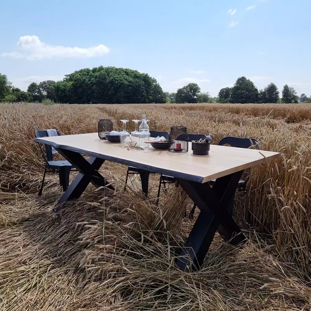 Le piètement croisé noir, associé au plateau en chêne massif aux bords brûlés, confère à la table X une allure contemporaine et sophistiquée. Ce jeu de matières et de nuances fait de cette pièce un élément fort de votre intérieur.