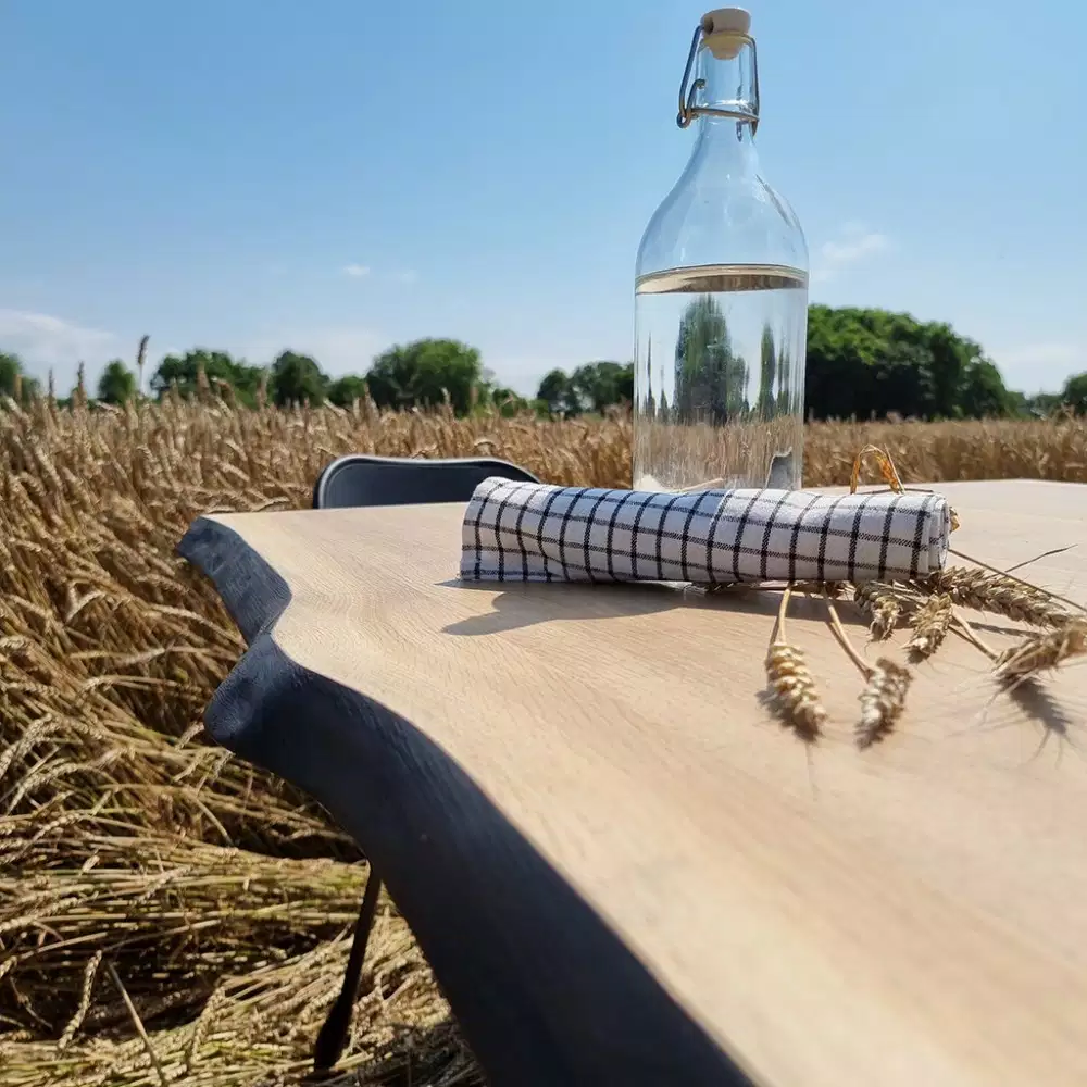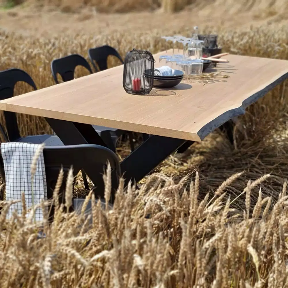 Chaque plateau est façonné dans un chêne massif haut de gamme, choisi pour son veinage unique. Le brûlage des bords révèle des textures profondes, offrant à chaque table un caractère unique.